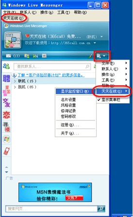 如果選擇綁定MSN模式,安裝完客戶端后,需要重新啟動(dòng)MSN,啟動(dòng)后MSN的菜單上將增加了“天天在線”這個(gè)菜單,點(diǎn)擊“顯示監(jiān)控窗口”即可查看有誰在訪問您的網(wǎng)站。