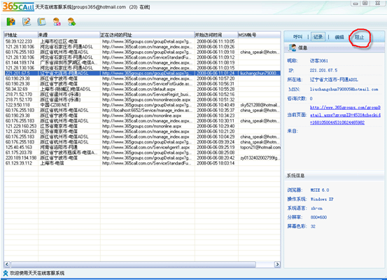 客服端主窗口,選擇某個訪客,然后點擊“阻止”按鈕;