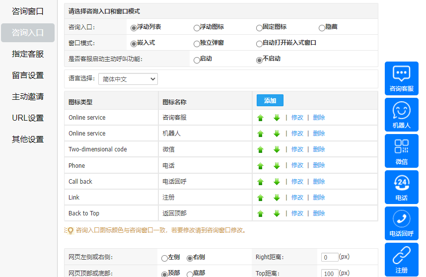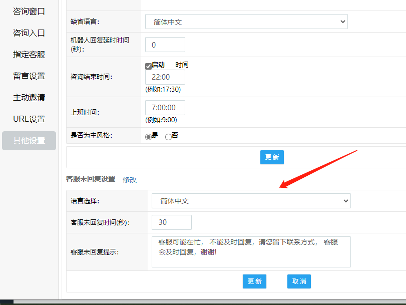 訪客可在客服休息時(shí)間或忙碌未及時(shí)回復(fù)時(shí)將自己的聯(lián)系方式留下,等待客服回呼解決問題,可在“系統(tǒng)設(shè)置-媒體對(duì)接-網(wǎng)頁(yè)(網(wǎng)站)-設(shè)置-咨詢?nèi)肟凇?/span>